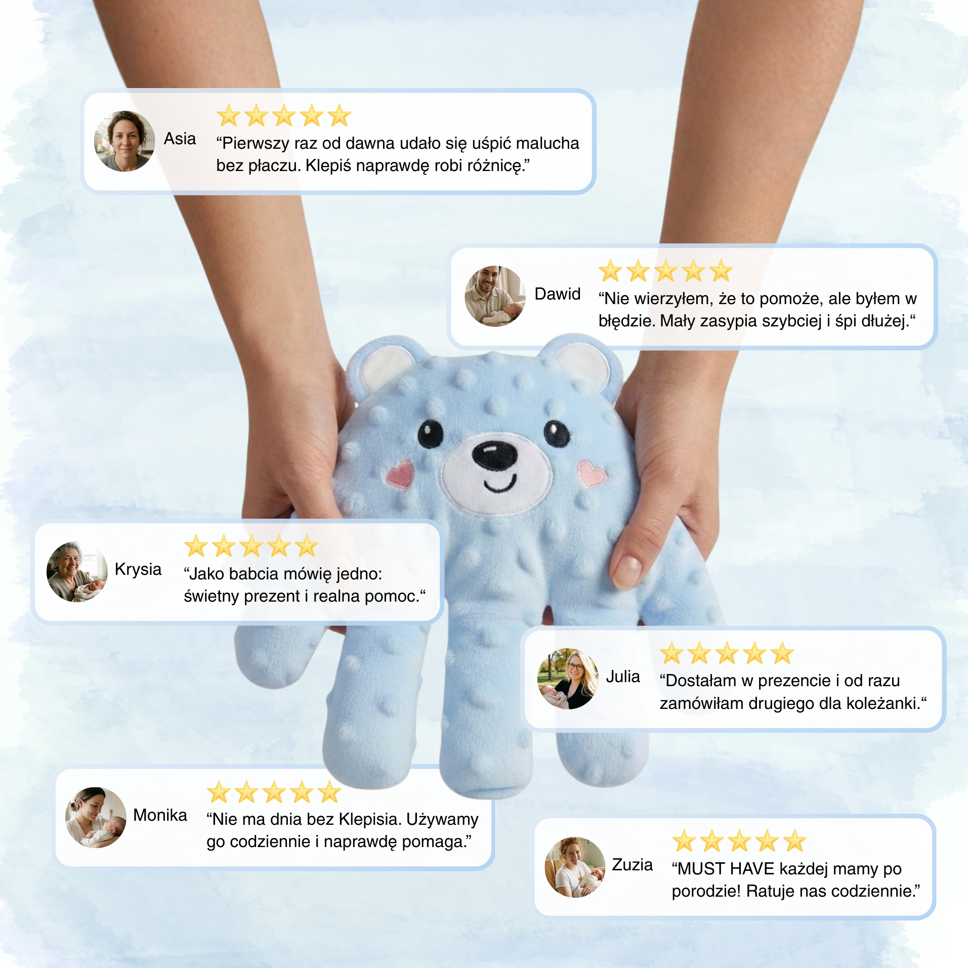 👉 Pamiętaj, że każde dziecko jest inne – niektórym potrzeba kilku dni, aby przyzwyczaić się do nowego „przyjaciela do snu”. W większości przypadków Klepiś staje się niezastąpionym wsparciem w codziennym usypianiu.
